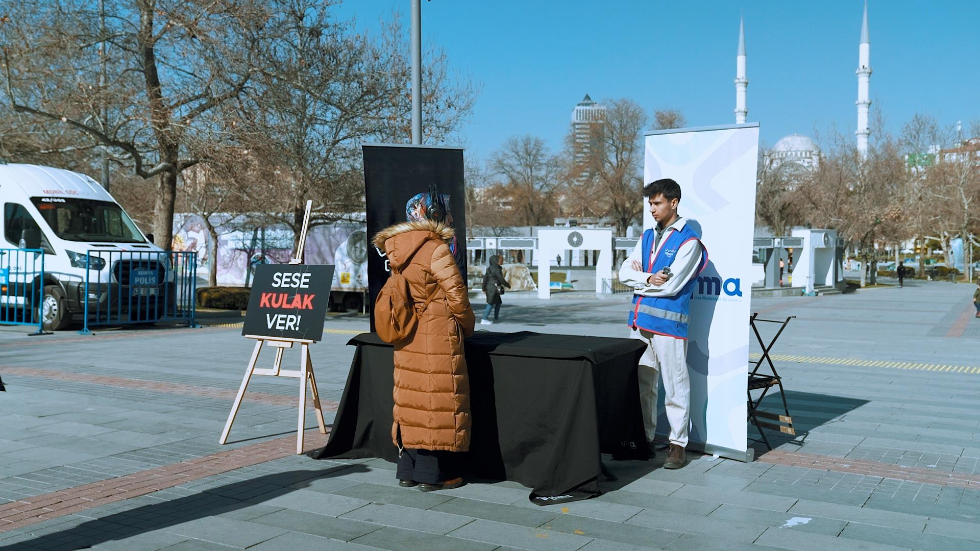 Konya Kültür Park Meydanı’nda kurulan stantta düzenlenen etkinlik, şehir merkezindeki yoğun yaya hareketliliği sayesinde farklı yaş gruplarından vatandaşlara ulaşma imkanı sundu. Sosyal deney formatında kurgulanan çalışmada, katılımcılara kulaklık aracılığıyla deprem sürecini hatırlatan ses kayıtları dinletildi.
